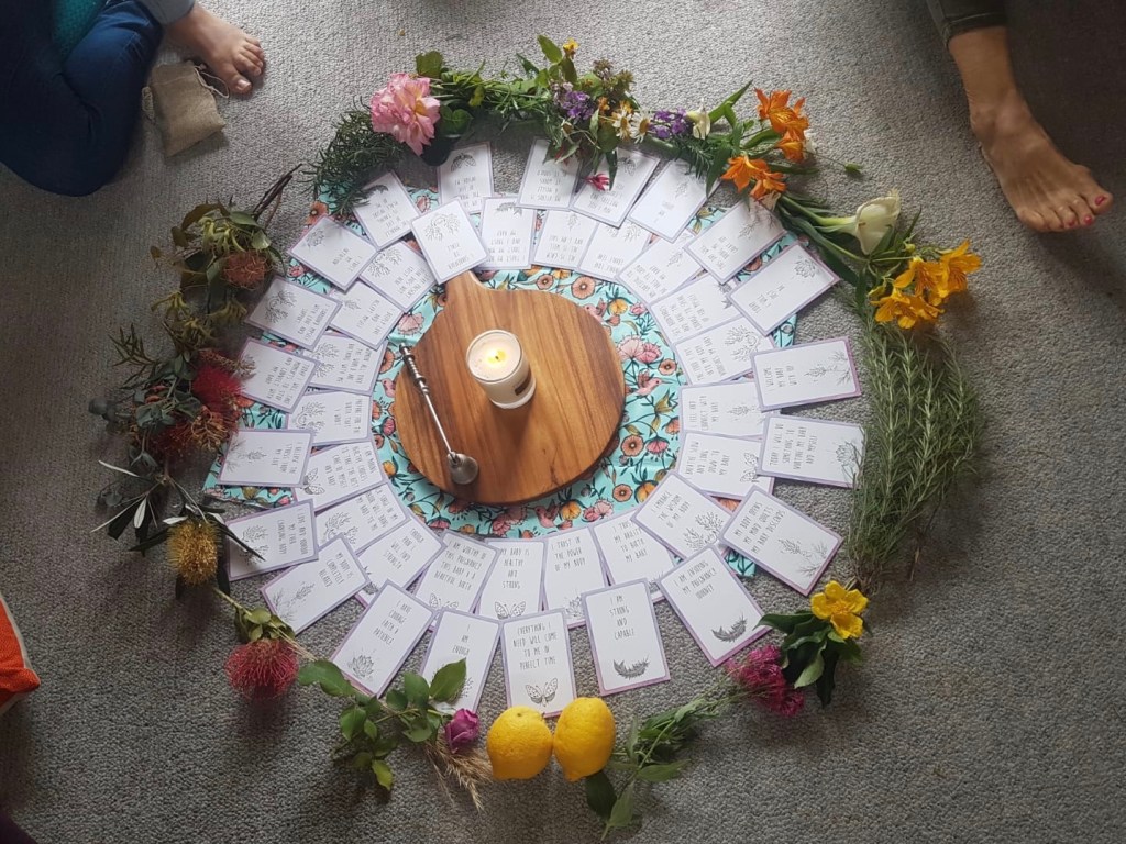 So, on the day you might like to get your coordinator/friend to facilitate the actual proceedings too. Simple things like going around the circle and inviting people to introduce themselves, to perhaps say something about their connection to the mother and what they value about her. Then to oversee some sort of bonding ritual that can become meaningful for you all. You could do a guided meditation or visualisation. You could breathe or chant together. Or just sit in silence. You could each take a turn to choose a card from a set of affirmations and speak about why you are drawn to it.